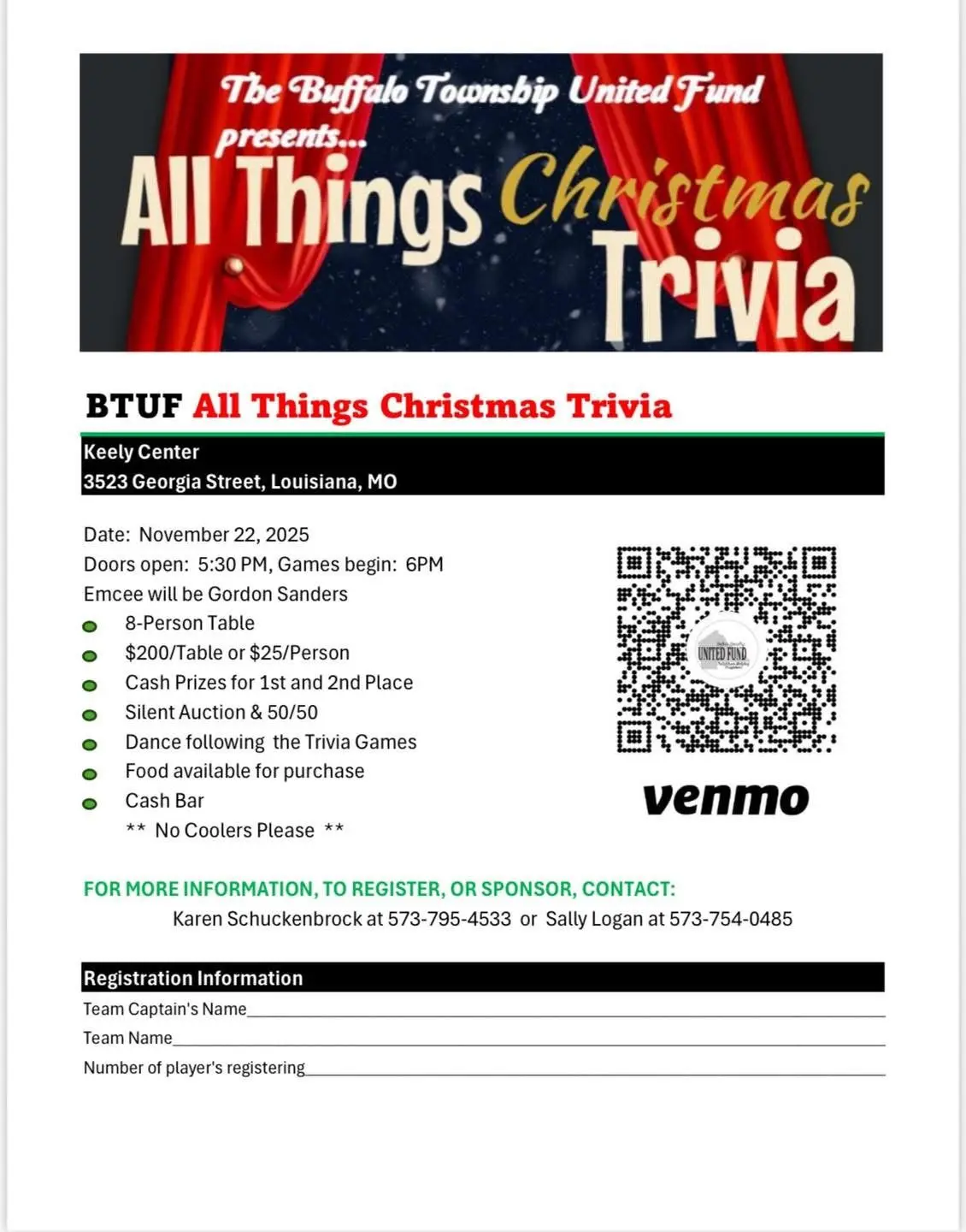Join the Buffalo Township United Fund on Saturday, November 22nd at the Keely Center in Louisiana for a festive night full of fun, food, and friendly competition!