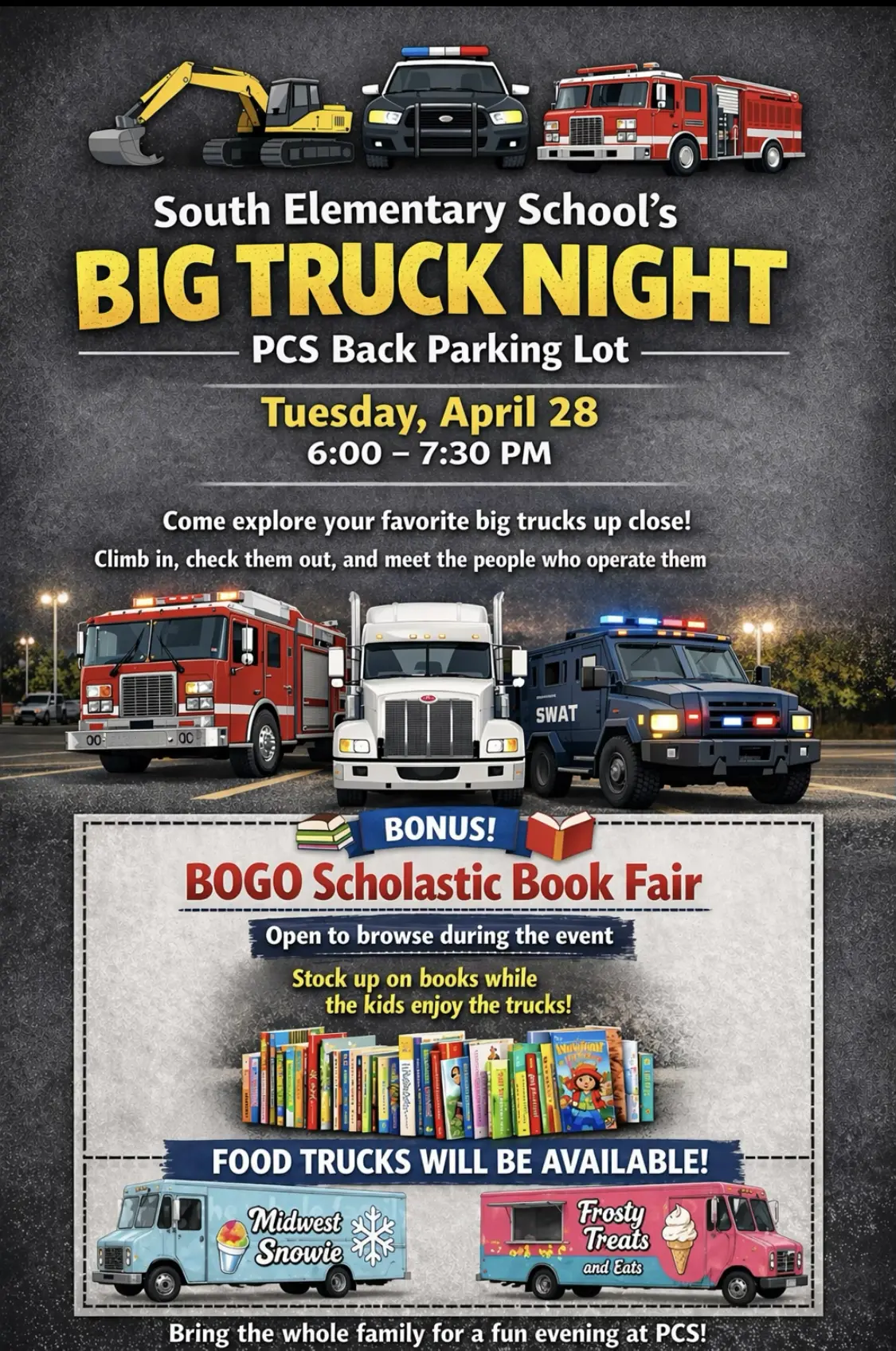 From 6:00 to 7:30 PM in the PCS back parking lot, kids can climb in, explore, and get up close with big trucks, emergency vehicles, and more—plus meet the people who operate them.