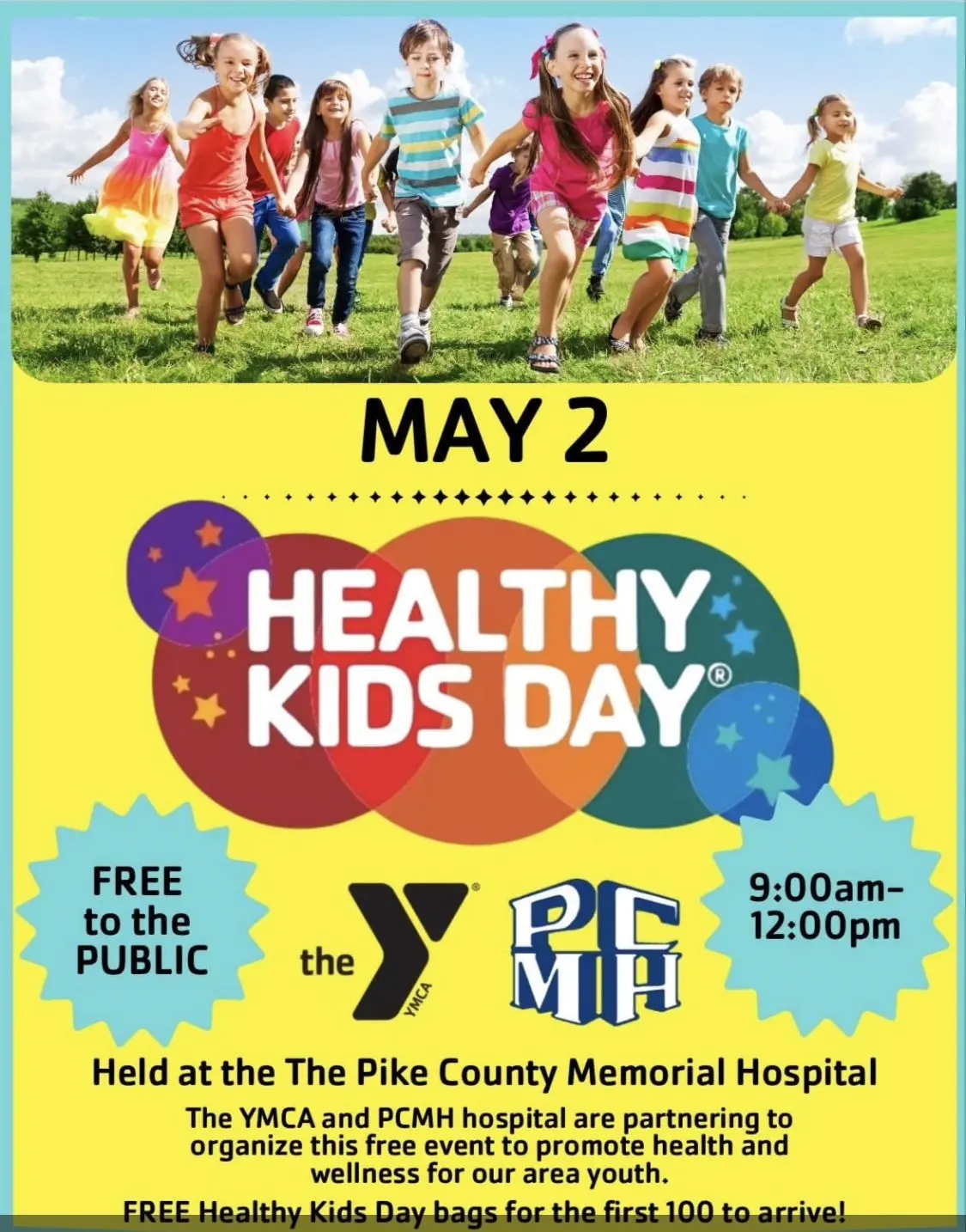 Join the YMCA and Pike County Memorial Hospital from 9:00 AM to 12:00 PM for a free event focused on health and wellness for kids.