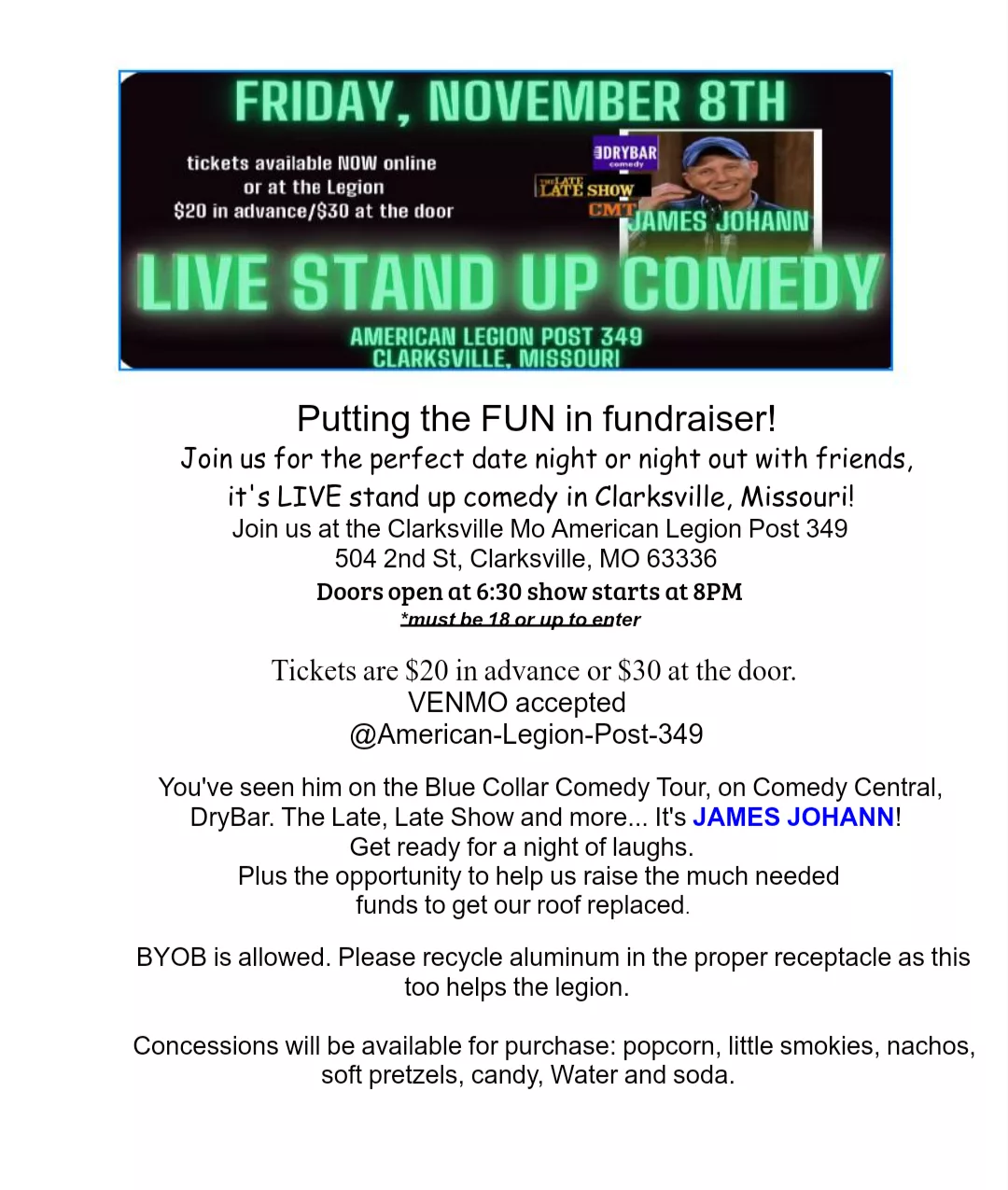 Clarksville comedy night is coming up on Friday, November the 8th at the American Legion Post 349 in Clarksville, Mo.
