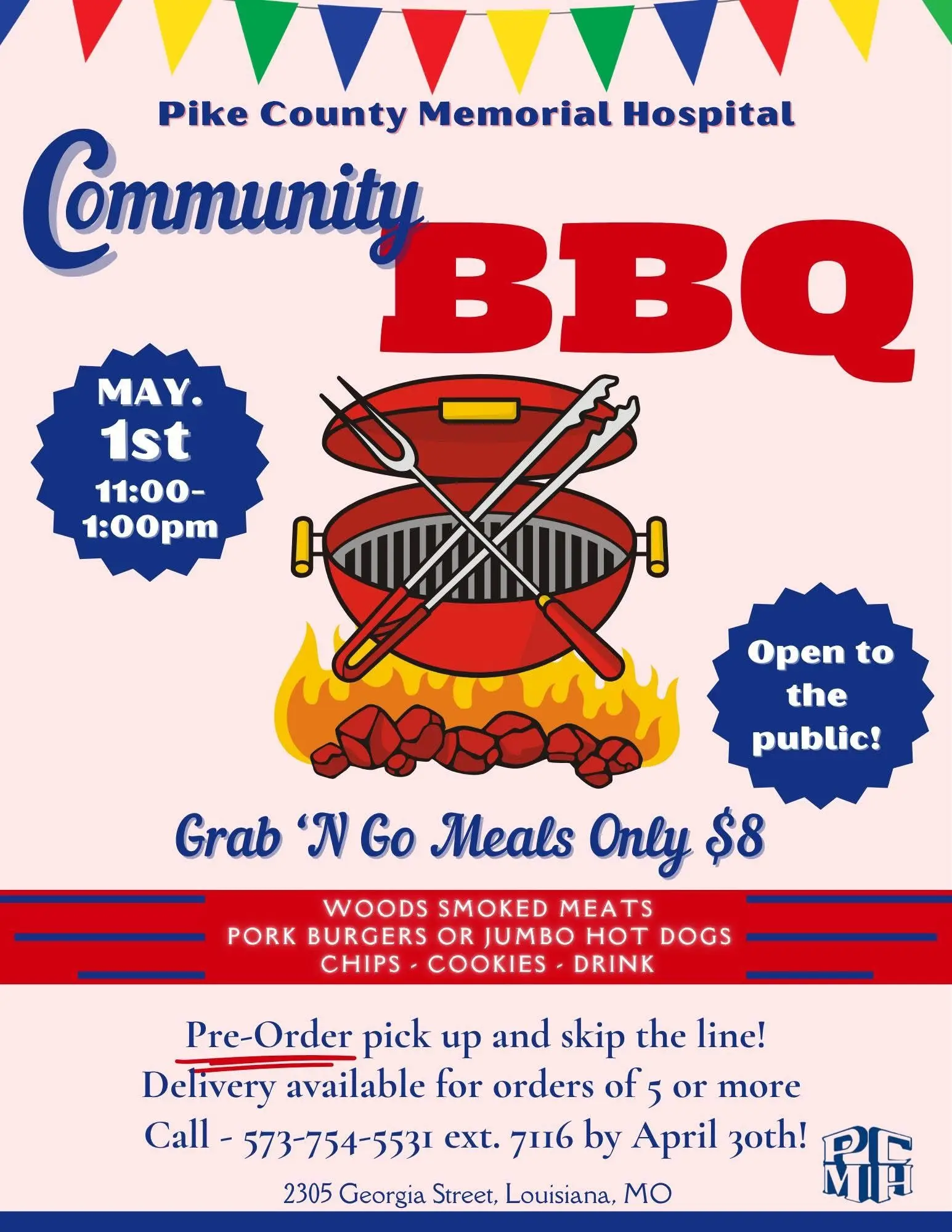 Pike County Memorial Hospital is serving up a Community BBQ on May 1st from 11:00 to 1:00. Grab ‘N Go meals are just $8 and open to the public.