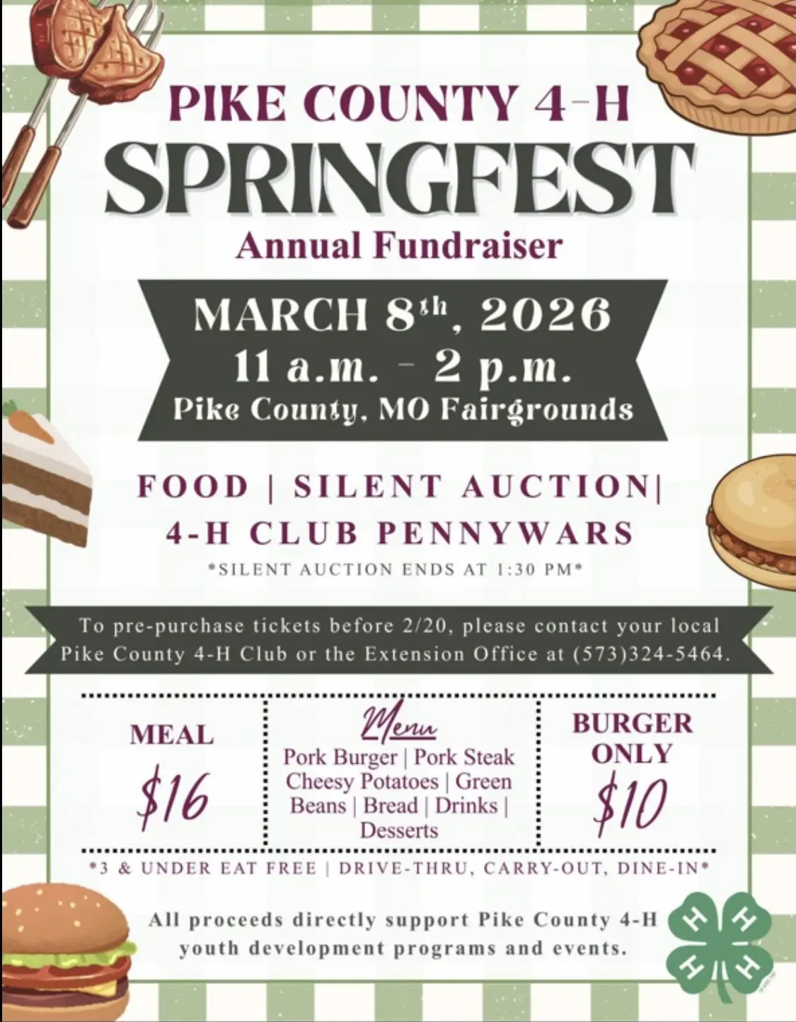 Tickets can be pre-purchased before February 20 by contacting your local Pike County 4-H Club or the Extension Office at 573-324-5464.