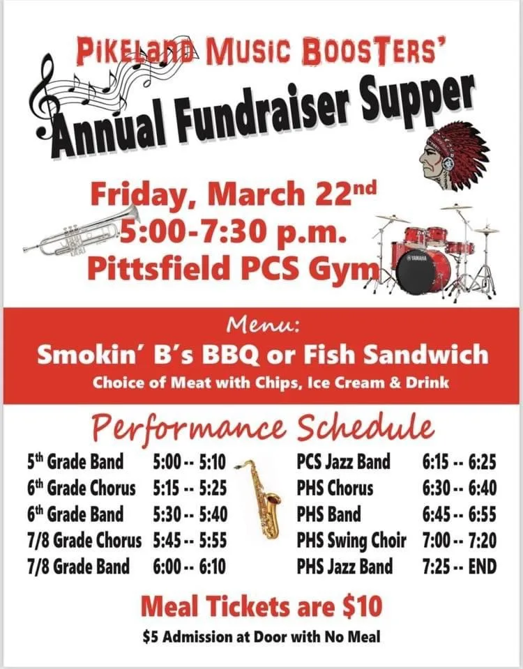 Pikeland Music Boosters Annual Fundraiser Supper will take place Friday March 22 from 5-730pm at the Pittsfield PCS gym.