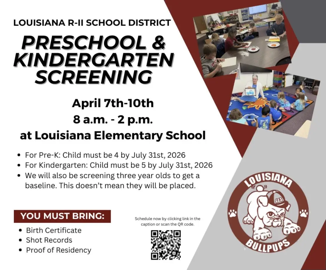 The Louisiana R-2 School District will hold Preschool and Kindergarten Screening April 7th through the 10th from 8 a.m. to 2 p.m. at Louisiana Elementary School. Children must be four years old by July 31st for Pre-K and five years old by July 31st for Kindergarten. Parents should bring a birth certificate, shot records, and proof of residency. Three-year-olds may also be screened for a developmental baseline.