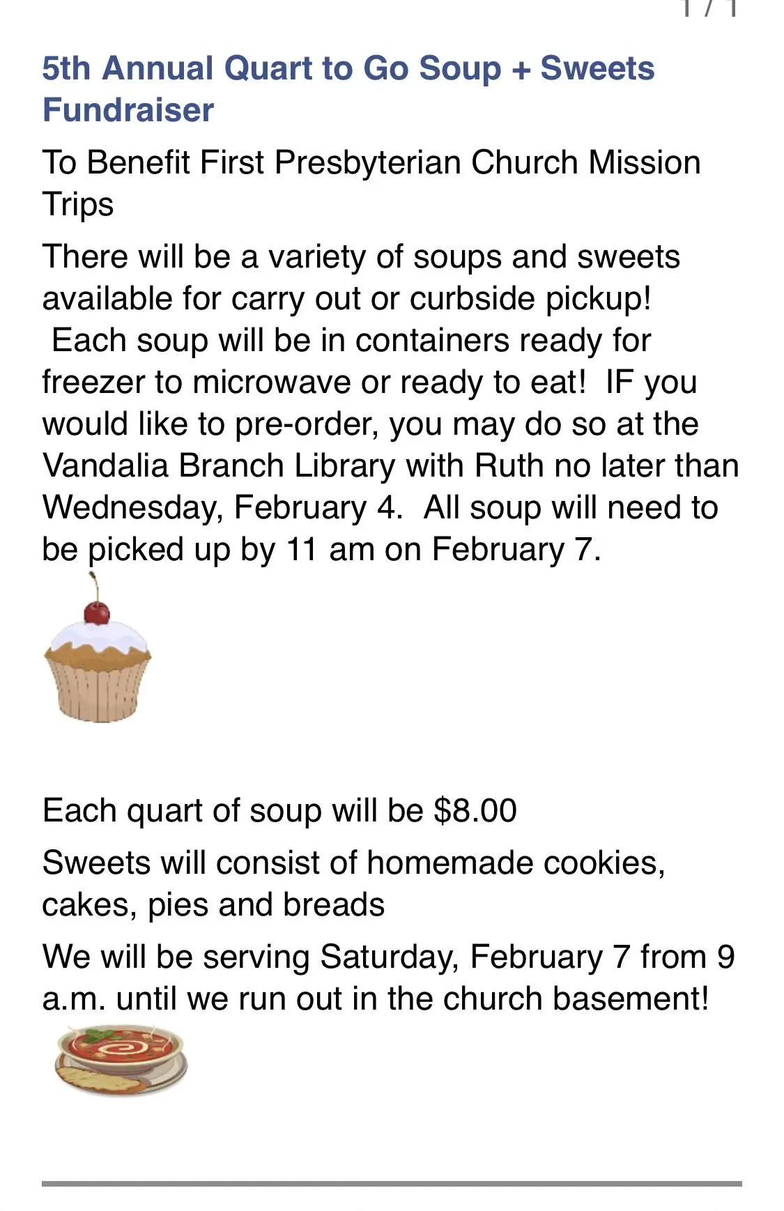 Warm up your weekend and help a great cause! The First Presbyterian Church in Vandalia is hosting the 5th Annual Quart-to-Go Soup and Sweets Fundraiser Saturday, February 7th, starting at 9 a.m. in the church basement. Grab a quart of homemade soup for just eight dollars, plus cookies, cakes, pies, and breads. Carry-out or curbside—while it lasts! Soup that fills your belly and helps fund mission trips