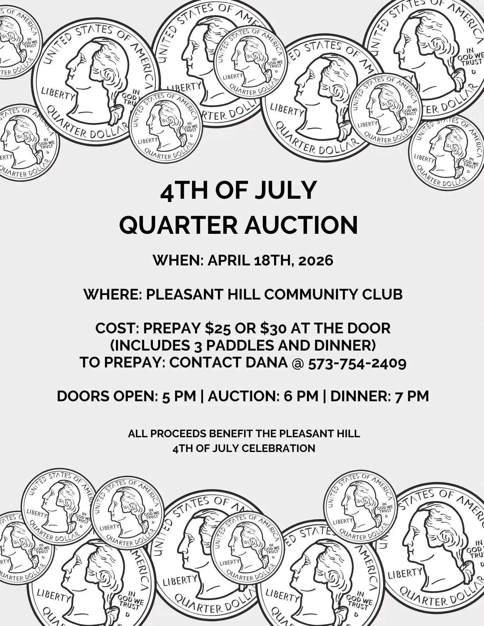 The Pleasant Hill Community Club will host a 4th of July Quarter Auction Saturday, April 18th at the Pleasant Hill Community Club. Doors open at 5 PM, the auction begins at 6 PM, and dinner will be served at 7 PM. Cost is $25 with prepay or $30 at the door, which includes dinner and three paddles. All proceeds support the Pleasant Hill 4th of July Celebration.
