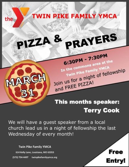 The Twin Pike Family YMCA is holding Pizza & Prayers on March 31st from 630 p.m. to 730 p.m.